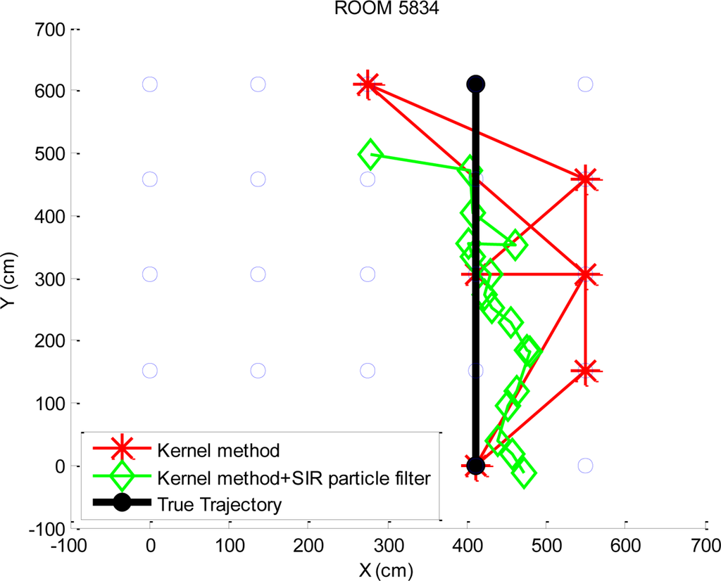 The dynamic experimental results of the KWNN algorithm and the KWNN algorithm with the SIR particle filter of K = 4 are also shown in Figure 13. Table 2 is the standard deviations of positioning errors by applying the kernel method and the kernel method with the SIR particle filter. The dynamic positioning results of the kernel method and the kernel method with the SIR particle filter are illustrated in Figure 14. The positioning error is defined as the difference between the positioning result and the true trajectory. It is obvious that the standard deviations of the positioning errors by applying the SIR particle filter are smaller. It means that the SIR particle filter can enhance the positioning performance as the object is in motion. From Table 2, it also shows that the standard deviations of the positioning errors are similar while selecting more candidates for the kernel method without the SIR particle filter. This experiment result is in accordance with the static experiment analysis in Figure 11.