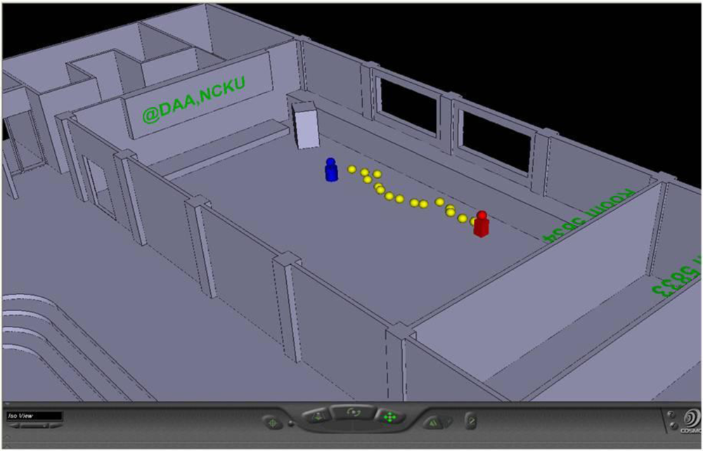 Finally, the indoor positioning results are integrated with the developed 3D GIS to show the user position in the 3D map. The integration result is shown in Figure 15. In Figure 15, the blue man represents the start position, the yellow balls are the user’s trajectory, and the red man is the end position. The VRML player used in this paper is the Cosmo player, and the user can choose other VRML player as well.