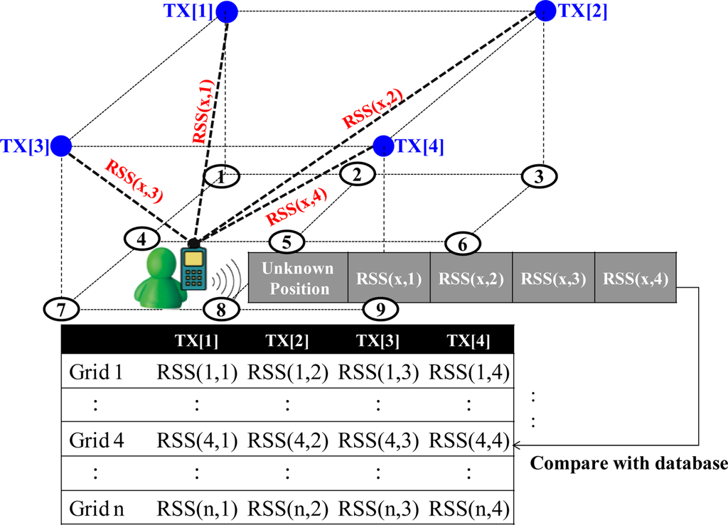 where rss(pos,i) is the received signal strength of the ith transmitter at the user position of pos, RSS(j,i) is the signal strength of the ith transmitter measured at the grid point j in the database, and Ns is the total numbers of the transmitters. The value of p can be chosen as 1 or 2. If p equals 1, the generalized distance is called Manhattan distance; otherwise, the distance is called Euclidean distance [15]. Through this calculation, the grid point with the minimum distance is declared as the user position.