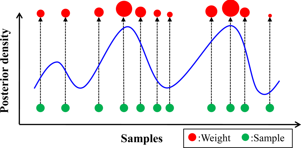 In Figure 4, each sample is associated with a weight according to the posterior density. If the number of the sample is large, the posterior density can be approximated by Equation (6) [13,16]: