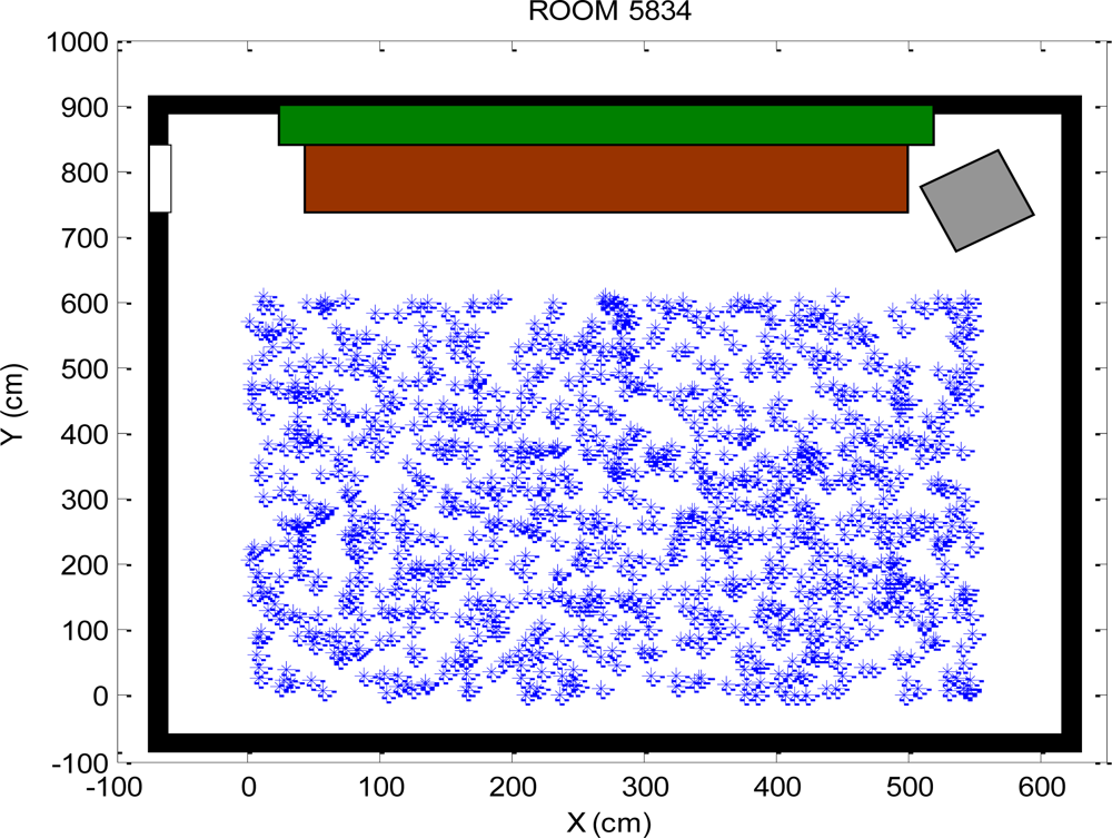 Figure 5. 1,000 particles with uniform distribution in the map. - Step 2: The evolution of the system states by drawing the from , if the system model can be expressed as Xk = f (Xk−1, vk−1), then . To simplify the estimation, the evolution of the system states through the system model is illustrated as Equation (12).where x and y are the horizontal and vertical position coordinates, respectively, Vx and Vy are the associated velocities, ax and ay are the associated accelerations, and Δt is the time step.