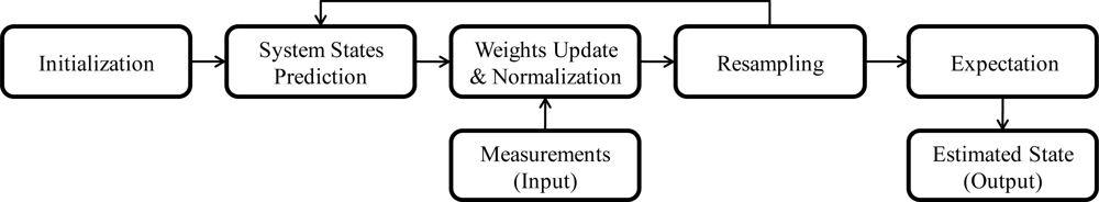 - Step 5: The states estimation at time k is the expectation value of the regenerated particles in Step 4 (i.e., ).