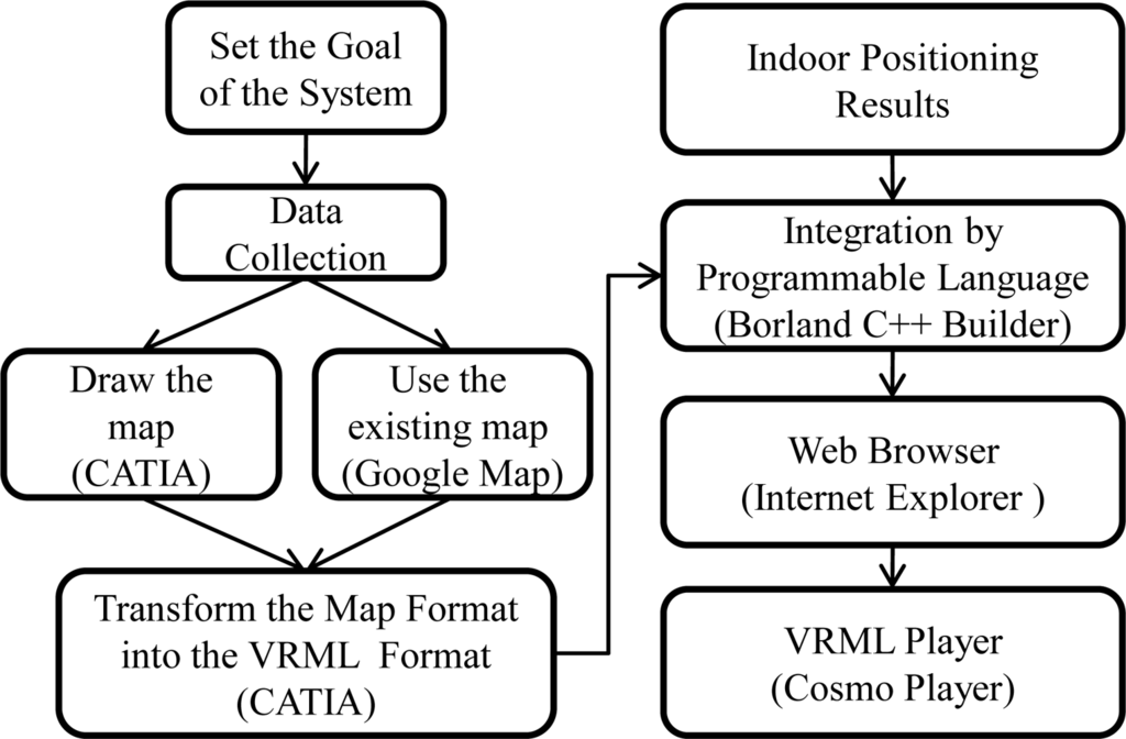 There are many smart phones and personal digital assistants (PDAs) which integrate the navigation services with the commercial GIS to provide useful location based information, such as the tourist attractions within a user’s vicinity. Nevertheless, the commercial GIS like the Google map does not provide detail information inside buildings. To achieve a complete LBS, an indoor GIS is needed. The major challenges for constructing an indoor GIS are to establish the indoor GIS and combine it with an indoor positioning system. In general, the program development tool (e.g., Visual C++) and the computer graphic technique (e.g., OpenGL) are used to develop the graphic system. However, if the requirements of the graphic system are complicated, it would be difficult to construct the graphic system by the method mentioned above. In addition, the maintenance and update of this graphic system would be difficult as well. To overcome this problem, the computer-aided design (CAD) software, such as the AutoCAD and CATIA, would be a better solution for the rapid graphic development. With the assistance of the CAD software, the developer could reduce the development time and the workload. However, the graphic format is different for different CAD software, and the compatibility for different graphic format needs to be taken into account. For that reason, the VRML graphic standard is used in this paper. In this paper a solution is proposed to establish the indoor GIS by the CAD software and the VRML technique [14], and then integrate it with the indoor positioning system. The development procedures are as follows: the first step is to set the goal of the GIS. After the setup of the goal, the next step is to collect the information required for this GIS, for instance, the building sizes and the location of the furniture in the room. The third step is to draw the maps by the CAD software. In order to integrate this developed GIS with other applications, the format of the map has to be change to fit the standards of the VRML. Finally, we can use the program development tool (e.g., C++ Builder) to integrate the developed GIS with the indoor positioning system developed in the previous section. The 3D map is shown through the web browser (e.g., Internet Explorer) with the VRML player (e.g., Cosmo Player). The overall development procedure is depicted in Figure 7.