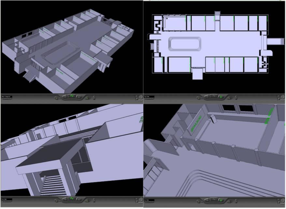 In this paper, we use C++ Builder to integrate the GIS with the indoor positioning system. The display of the VRML files needs a specific viewer, and the VRML viewer used in this paper is the Cosmo player. Several snapshots of the 3D GIS of the DAA building are shown in Figure 8.