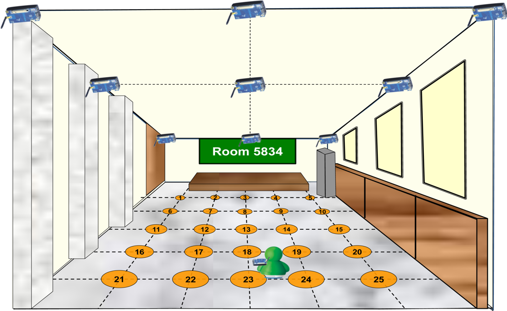 Considering the power consumption, ZigBee radio was employed to construct the WSN for the indoor positioning test bed. The wireless modules used in this paper is the IRIS® which are developed by Crossbow Inc. The IRIS wireless module can be treated as the transmitter or the receiver. The received data is transmitted via USB port. The classroom 5834 of the DAA of NCKU is used as the experiment place. To implement the indoor positioning system, the collection of the database for the positioning system is required. We attach 9 IRIS motes on the ceiling as the transmitter and divide the floor of the classroom 5834 into 25 grid points, and then visit these grid points in sequence to measure the RSS values of the incoming signals from the transmitters which are attached on the ceiling. These RSS values and the corresponding coordinates are saved in the database. The size of each grid is 137.25 cm by 152.5 cm, and the separation distance between each sensor attached on the ceiling is 274.5 cm. The setup and the arrangement of the experiment are shown in Figure 9. All the training samples and the test samples are acquired at the same day. The total training samples are 47,088 samples, and the average training samples at each grid point are 1,883 samples.