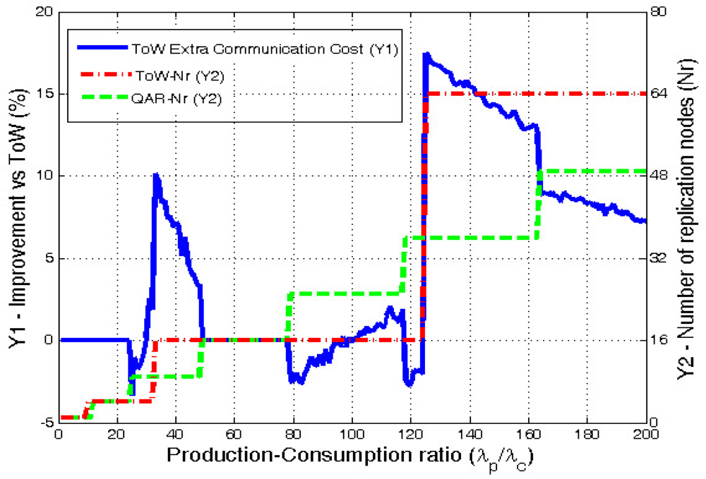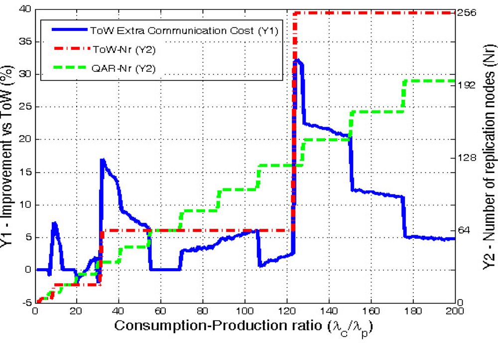 Figure 9 clearly shows that QAR is more adaptive than ToW because the number or replicas increases in smaller steps than ToW. Moreover, QAR is the one that minimizes the communication cost. ToW needs in average 7.56% more extra hops in the communications. If we look carefully at the results, they show that the improvement is specially significant when ToW model decides to increase the number of replicas. Then, during the cases where ToW uses d = 2 (16 replicas) the results show a maximum extra communication cost of 7.28% compared with QAR. In the cases where ToW chooses d = 3 (64 replicas), QAR improves ToW in average a 5%, with a maximum of a 17%. Finally, the case when ToW selects d = 4 (256 replicas) demonstrates that applying ToW with high ratios is not good enough due to its low adaptivity. In this case the maximum extra cost is 32.3% being the average gain of QAR a remarkable 13.5%.