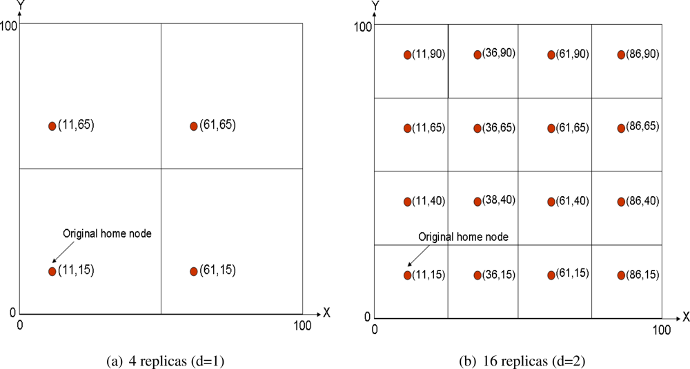Ratsamany et al., the original DCS authors, were already aware of this problem and proposed a grid-structured multi-replication system [30, 31]. They assume a square sensornet field that is divided into 4d grids, being d the so-called network depth. The original home node is established as defined in GHT, that is applying a hash function over the event type. After that, 4d − 1 mirror replicas are allocated in the same relative position inside each cell of the grid. Figure 2(a) shows a multi-replication scenario with d = 1 and Figure 2(b) with d = 2. Of course the coordinates shown in the figures refer just to space locations, thus the closest node to each location is the home replica node in that grid. This mechanism is recursive, because replicas of level d are also replicas of level d + 1.
