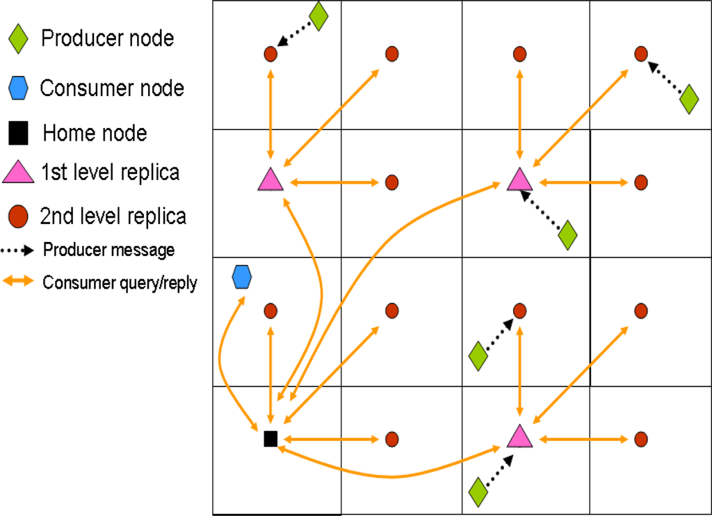 With this system, a producer generating an event stores it in the closest replication node. Then, in order to retrieve all the data related to a particular event, a consumer queries the top home node (d = 0). This one in turn forwards the query to the remaining first level replicas (d = 1), that in turn do the same with their second level replicas (d = 2), and so on, in a recursive manner. The replies to the query travel the same path back to the original home node, which finally sends the information back to the consumer. Therefore, the information retrieval is based on a hierarchical routing that also relies on GPSR. Figure 3 depicts an scenario example including both production and consumption communications.