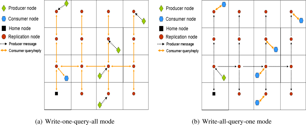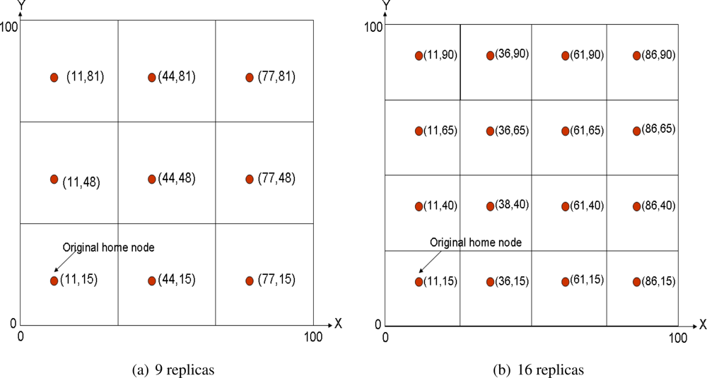 There are no further discussion of multi-replication in [30, 31], but just a final remark: the proposed muti-replication environment reduces the storage cost in front of using a single home node, but increases the query cost, since now consumer packets travel longer to get the information.