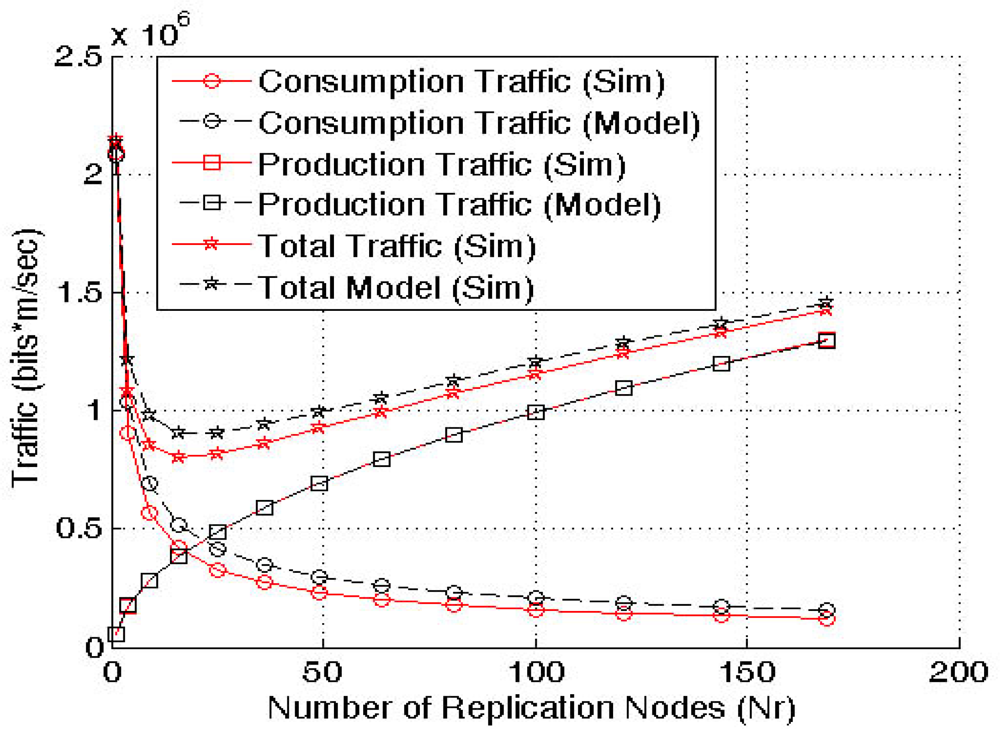 , provided by ToW and QAR analytical models. We compare the traffic load in number of hops for GHT with a single replica, ToW (with k = 1) and QAR in the same scenario. We cannot include GHT with multiple replicas in this evaluation because the authors do not propose any model or heuristic mechanism to calculate the optimal number of replicas to be used.