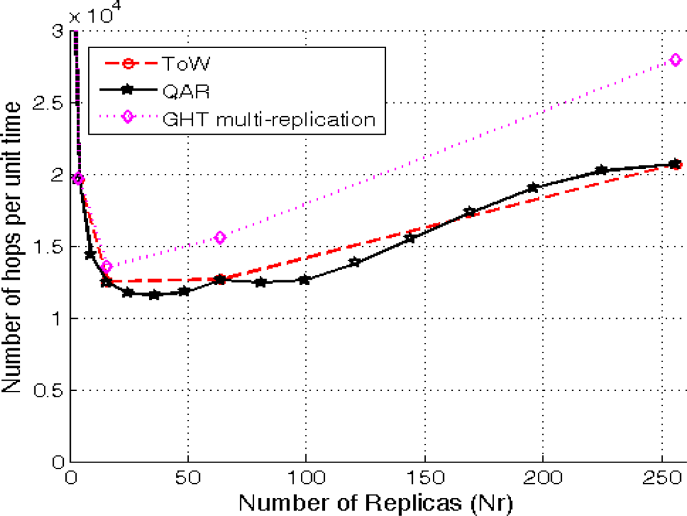 We simulate a sensornet with an area A = 1,000 × 1,000 square units, N = 5,000 sensors deployed at random and a transmission range Tx = 60 distance units. In order to simulate the traffic load among the 5,000 sensors, we randomly select 20 consumers and 2,000 producers. Consumers and producers generate traffic in a regular basis, that is, each consumer produces 1 query per unit time and each producer generates 1 data event per unit time. So that, we measure the traffic load in total number of hops in the sensornet per unit time using different number of replicas for each solution (i.e., 1, 4, 16, 64 and 256 for ToW and GHT with multiple replicas, and 1, 4, 9, 16, 25, 36, 49, 64, 81, 100, 121, 144, 169, 196, 225 and 256 for QAR that, as it has already been described, has more granularity). The results shown in Figure 8 are the average traffic values (in number of hops per unit time) over 50 different scenarios for each number of replicas being evaluated.