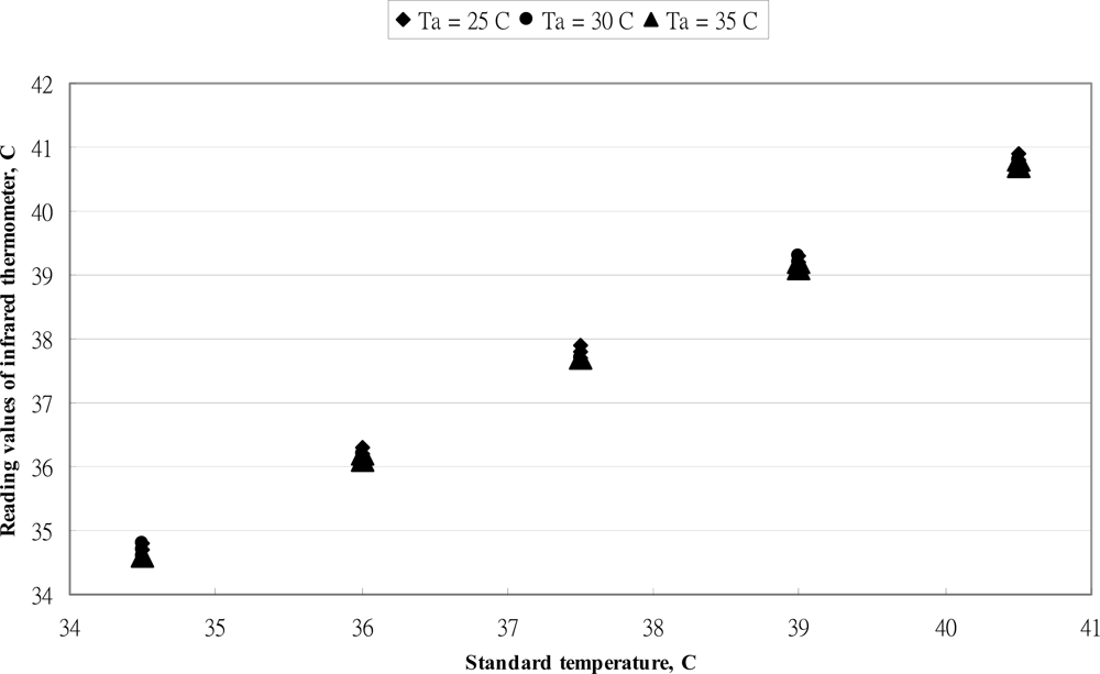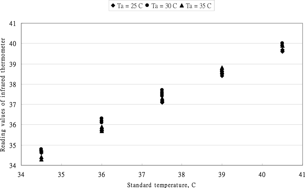Each infrared thermometer was randomly measured at five sets of standard temperatures at the same ambient temperature. Five replicates were made for each standard temperature. As one measurement was made, the infrared thermometer was taken out of the blackbody cavity for five minutes and then put into the cavity again for further measurement.