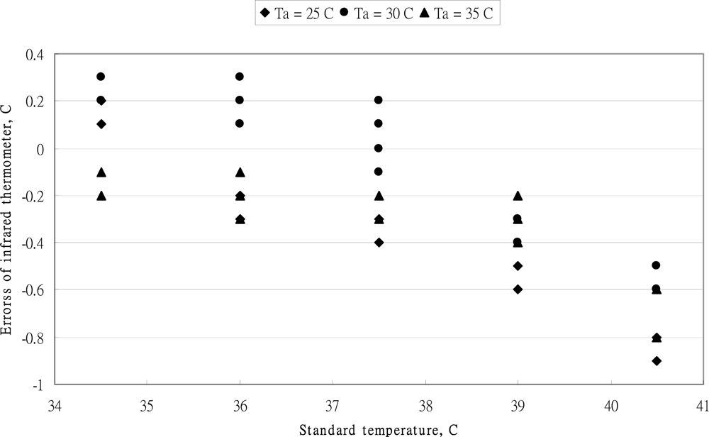 The target temperature for calibration of infrared thermometer was maintained at 34.5, 36.0, 37.5, 39.0 and 40.5 °C. The performance test experiment was executed in an environmental chamber at three levels of ambient temperature: 25 °C, 30 °C and 35 °C. The variation of the setting temperature was controlled within ±1 °C.