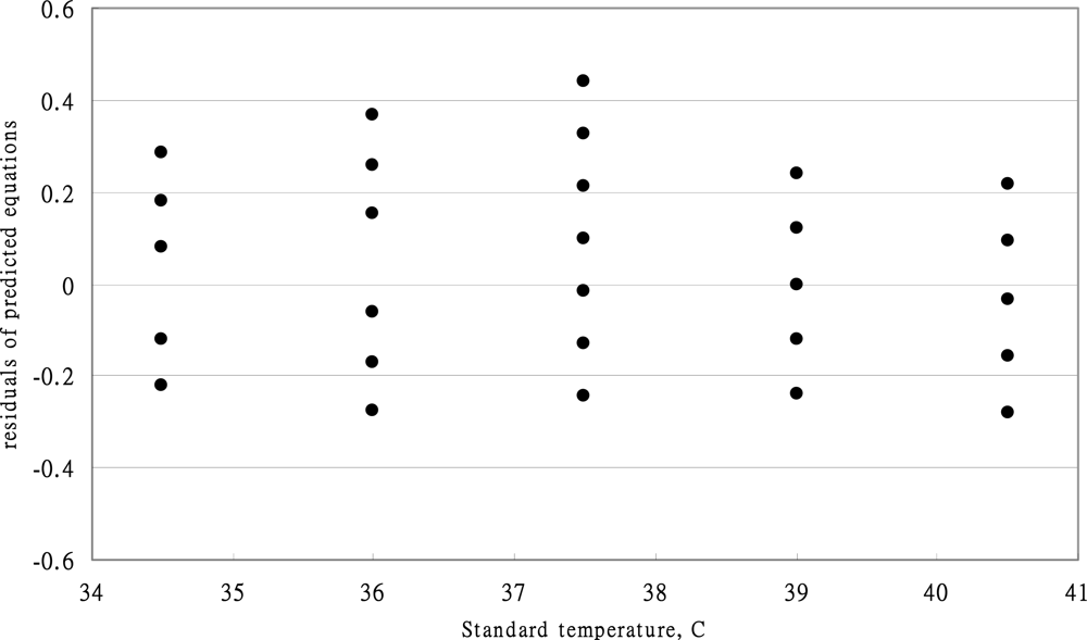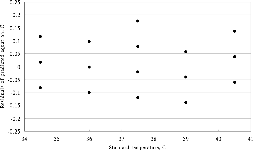 The predicted errors of Equation (12) are shown in Figure 6. All the predicted errors were located within the requirement range of the ASTM standards except for the standard temperature of 37.5 °C. However, the mean value of several replicates at this temperature could reduce the predictive errors.