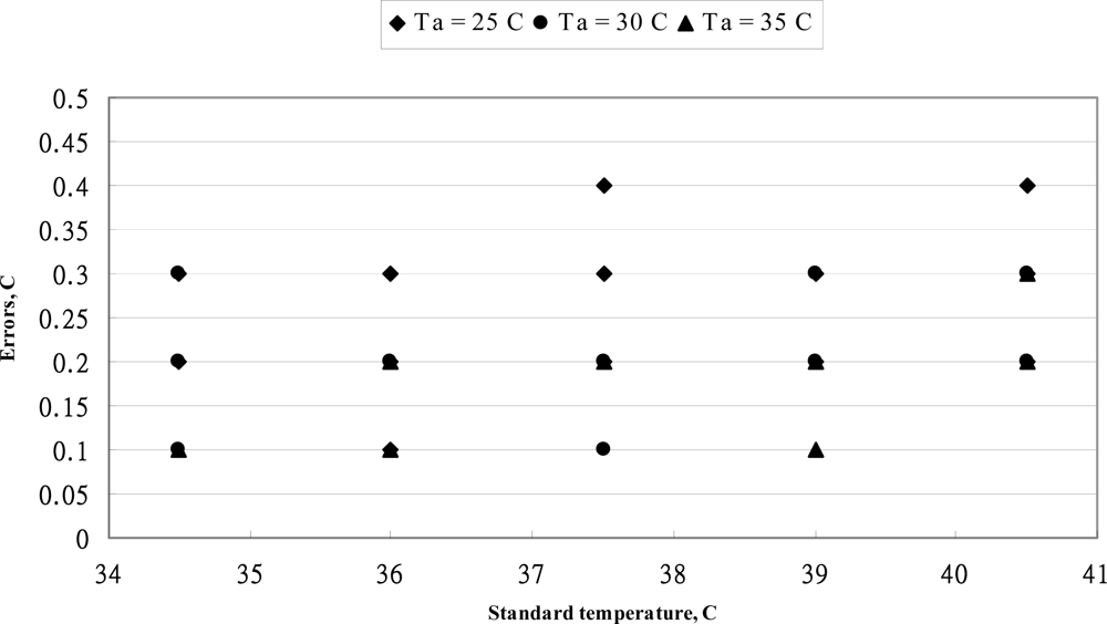 The reliability and accuracy of infrared tympanic thermometer have been discussed by many researchers. Their results are inconsistent. Dodd et al. [] compared the reading values of infrared ear temperature for children aged between 0 and 18 with that of rectal thermometry. Their conclusions indicated that the infrared ear thermometer would fail to detect fever in 75% of febrile children. Craig et al. [] found that the pooled mean temperature difference for rectal temperature minus infrared ear temperature was 0.3 °C. The significant difference (significance was taken as p < 0.05) was found between two sets of data. These authors suggested that the infrared ear thermometer did not indicate the sufficient agreement with the body temperature measured by rectal temperature. Kistemaker et al. [] evaluated the performance of an infrared forehead thermometer. They concluded that this Sensor Touch meter could work well in stable conditions. The average difference between the infrared forehead thermometer and a rectal sensor ranged from 0.3 to 0.5 °C. Kocoglu et al. [] compared three body temperatures. The rectal and auxiliary temperatures were measured with glass mercury thermometers. The aural temperature was measured by an infrared thermometer. They concluded that the infrared tympanic thermometer could be applied in an emergency room setting. Rosenthal and Leslie [] compared the accuracy of an electronic and an infrared thermometer with traditional glass mercury thermometry in the 95% confidence level. They found the average difference between the reading values of infrared thermometer and glass thermometer was within 0.1 °C. Stavem et al. [] assessed the accuracy of infrared ear thermometry, by measuring the rectal and esophageal temperature with thermistor thermometer and ear temperature by infrared thermometer. The mean of two ear temperatures had better agreement with the rectal temperatures.