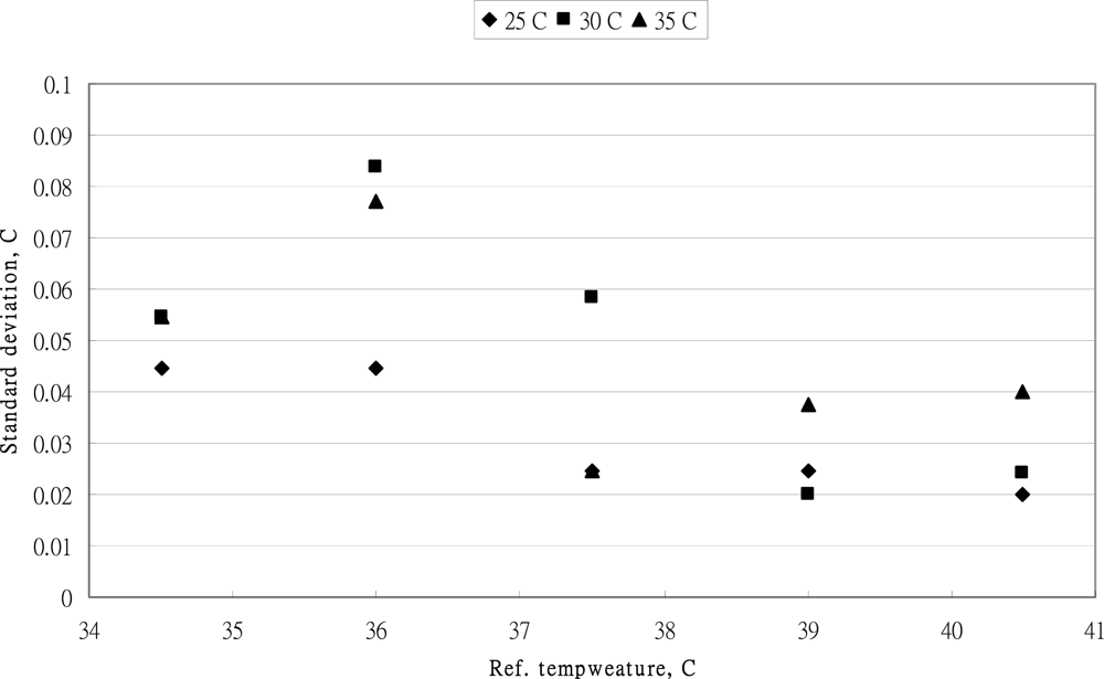In comparison with the variations of measurements, the standard temperature has significantly affected the variations of standard deviations. However, the ambient temperature showed no significant effects on the variation of measurements (P = 0.1305>0.05). The ambient temperature did not influence the variation of standard deviation of each measurement. The uncertainty source of ambient temperature was not considered for the evaluation of uncertainty of the MC-510 thermometer. The distribution of standard deviation of the Braun IRT-3020 measurement is presented in Figure 8. The ambient temperature did not have the significant effect on the standard deviations. At the standard temperature of 39 °C, the standard deviations were closed at 39 °C.