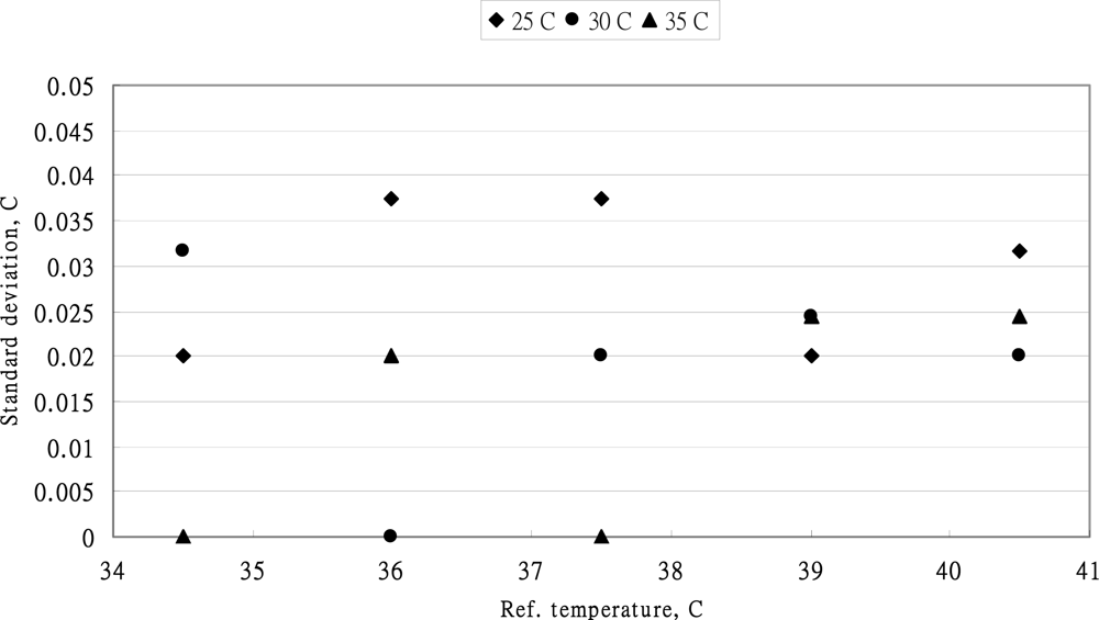 The standard deviation of five measurements of MC-510 thermometer at different standard temperatures and three levels of ambient temperatures are shown in Figure 7.