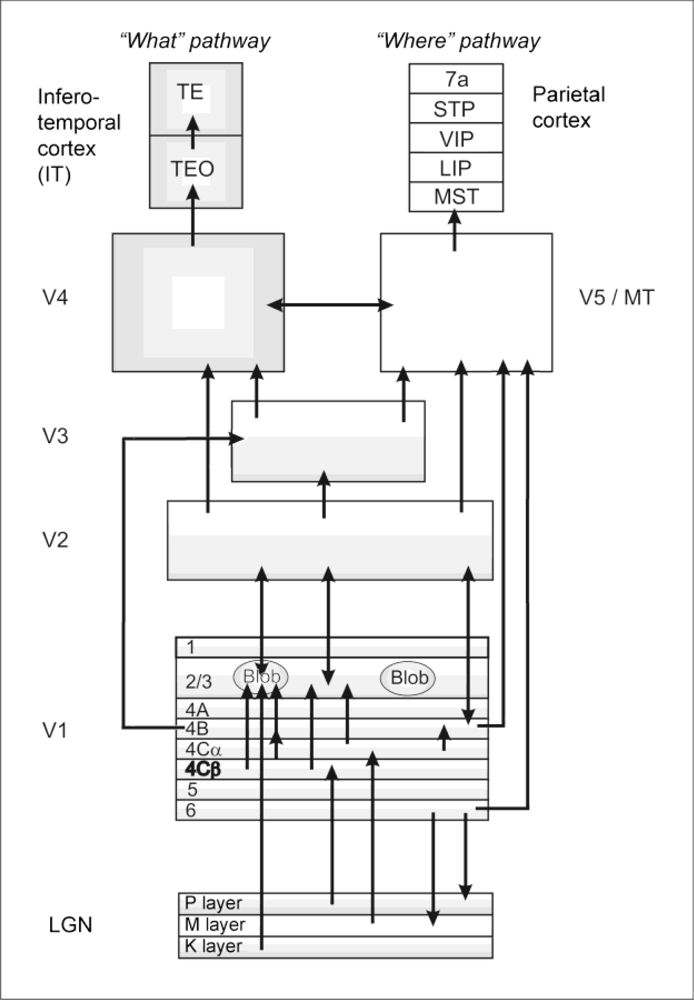 Schematic representation of the primate visual pathways. The left half of the figure represents the ventral (“what”) stream, while the right side shows the hierarchical organization of the dorsal (“where”) stream. Abbreviations: LGN—Lateral geniculate nucleus, V1, V2, V3, V4—Primary (first), second, third, fourth visual cortices, respectively, TEO—Posterior inferior temporal cortex, TE—Anterior inferior temporal cortex, V5/MT—Middle temporal area (fifth visual cortex), MST—Medial superior temporal area, LIP—Lateral intraparietal area, VIP—Ventral intraparietal area, STP—Superior temporal polysensory area, 7a—Visual area 7a in the parietal cortex (Brodmann’s terminology).