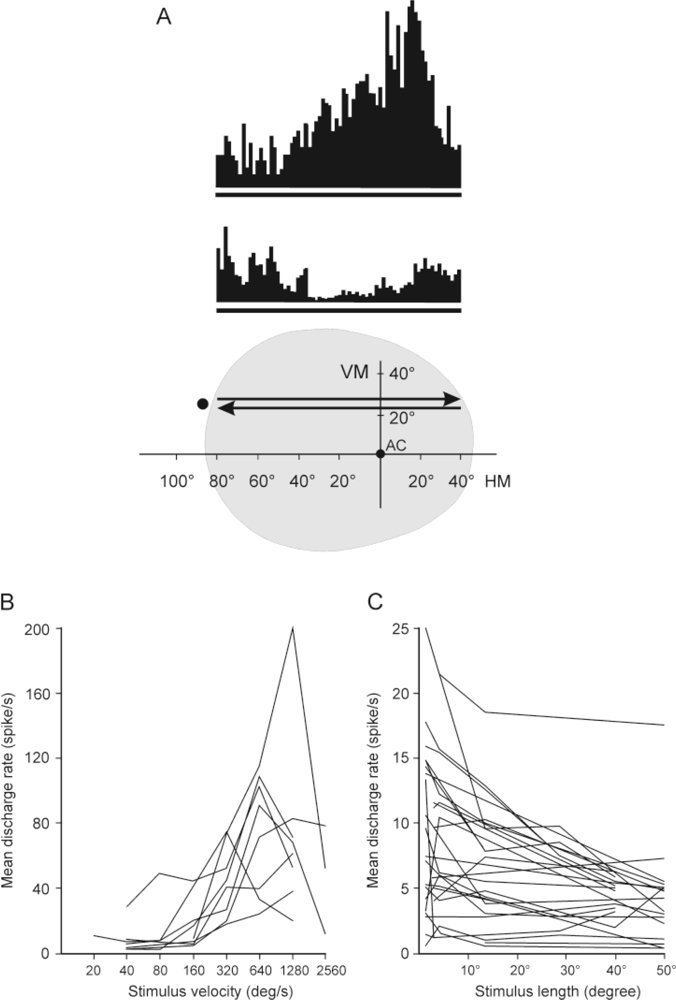 A striking physiological characteristic of these neurons (i.e., in the AEV, IVA, LM-Sg, CN and SN) is their overwhelming sensitivity to movement in the receptive field. First, we found that the neurons were primarily sensitive to small stimuli moving very rapidly in a specific direction in the huge receptive field (Figure 4).