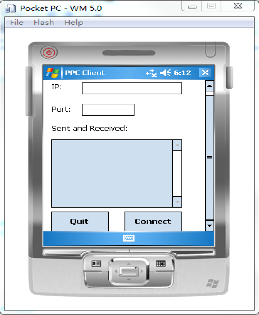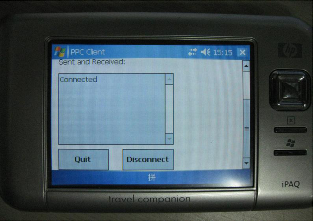 The user interface of the PDA is shown in Figure 10. The program loads the test sampling data when it is launched, and the user can input the IP address and port number of the server. The connected user interface is shown in Figure 11.