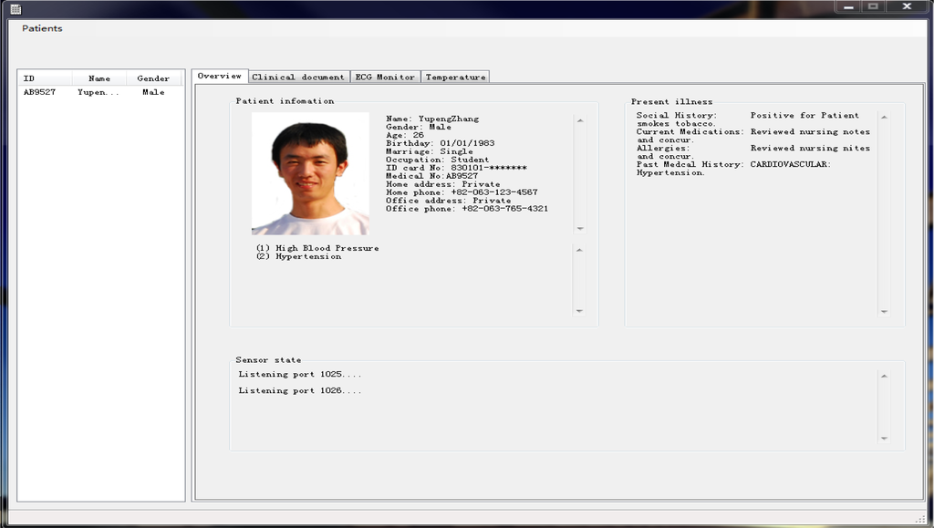 The main page of the user interface shows personal information and the illness description. The user list is shown in the listview control on the left, and medical personnel can click the “Patients” button on the menu to add a user and display them in the listview control. The user’s information is then displayed in the “Overview” tab on the tabframe control. Medical personnel also can delete a user selected in the listview control, and the personal information is then removed. The program continually listens to the 1025 and 1026 ports for any client connection, and the connection state is shown in “Overview” tab. The Tabframe control consists of four separate tabs. The “Overview” tab shows the user personal information, illness and connection states and “Clinical document” tab shows the personal information and illness description in XML, conforming to clinic document architecture of the HL 7 standard.