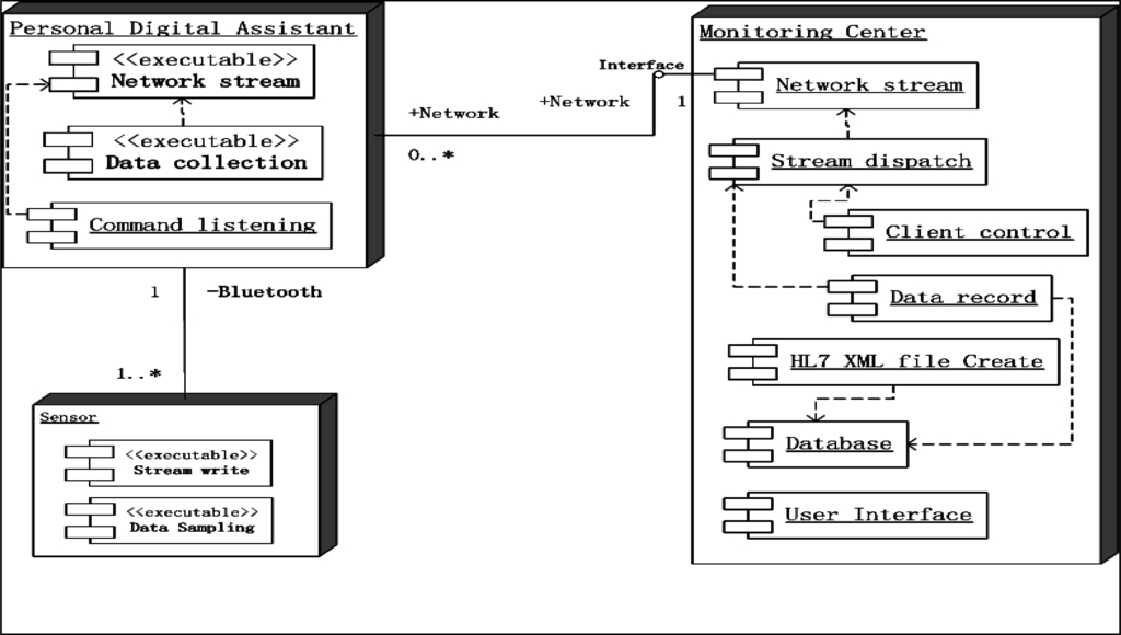 The proposed system remotely monitors the states of patients and relays electrocardiogram (ECG), temperature, glucose, and/or other types of data. Patients are required to wear the appropriate sensor(s), have a mobile device, such as a PDA, and be in an area with suitable, wireless network access. Generally, sensors cannot communicate directly with wireless networks, due to prohibitive production costs, and a sensor needs hardware and software that provide the requisite communication. In the proposed configuration, the sensors are connected to a closely located PDA through a wireless connection, such as the Bluetooth connection, as shown in Figure 2. The PDA can connect to a wireless Access Point (AP) or router, thus providing the communication channel with the monitoring center. The sensor can be an RFID tag on the patient which provides the exchange of data with the PDA through a wired connection or wireless Bluetooth. The user should register with monitoring center to acquire the necessary preliminary information, recording personal information, present illness and illness history, etc., and be assigned a unique medical identification tag. The monitoring center can then provide suitable security and verification of the user identity for remote access to the server. The network can be an xDSL, optical fiber or other access type provided by the Internet Server Provider (ISP), and the wired access cable can connect to the wireless router. While this type of wireless access can be easily distributed in a residence or office, the wireless router cannot provide seamless roaming. This is because the PDA needs to re-access and re-require a new IP address while roaming between various wireless areas. The solution is to provide an access point (AP), which are wired connections to a switch hub or router, and allow the PDA to connect to access points though this wireless connection and allow PDA roaming. This proposal is focused on monitoring and data transmission and uses the wireless router as the transmission media, due to equipment restrictions.
