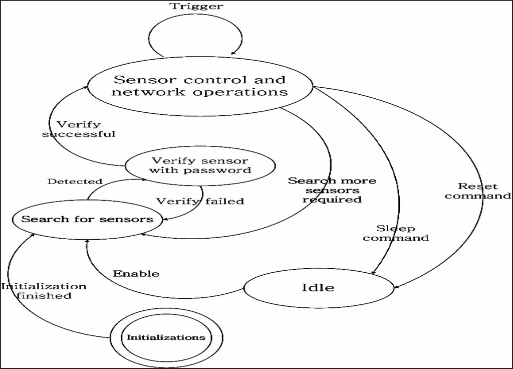 A password could be assigned by user when first time register to or purchase from medical organizations, and this password is needed when the sensor connect to mobile device. The mobile device functions between the sensor(s) and server transmissions. The mobile device searches the sensors when it launches and connects to the server when a sensor is detected and authenticated. The authentication process of the mobile device fails when multiple sensors are detected and the medical identification in any UUID field is different. Authentication failure can also occur when the server password verification fails. The mobile device work states shown in Figure 4 will change to the “search for sensors” state, after initialization. It remains in this state until some sensors are detected. It then changes to the “Verify sensor with password” state and asks for the sensor password and medical identification number. If the server successfully verifies, the mobile device state changes to “Sensor control and network operation”. The mobile device forwards the data stream coming from the sensor to the server. The mobile device listens to the network for commands and, if any trigger commands are received, such as “Stop ECG data sending”, the mobile device will control the related sensor, but still keep connected to the sensor. The “Idle” state is for devices self-testing, if any abnormalities are detected by the server.