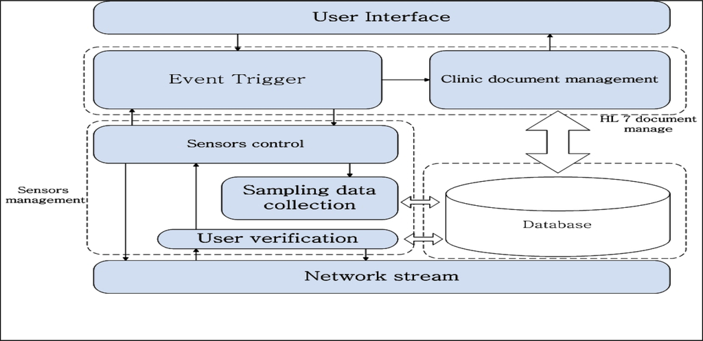 The document management module is between Graphical User Interface (GUI) and sensors control, through the event trigger handling, and it is the main control module of the software. The majority of the events are created by medical personnel through the GUI. When a user name is clicked in the user list, the GUI generates a user view event, and the event trigger module responds to this event and locates the user information by invoking the clinic document management module. The main function of clinic document management module is to create, revise, view, and delete user information. A clinic document is formed as an XML file conforming to the CDA standard of HL7. The clinic document records all of the personal information, such as name, gender, age, home address, symptoms, present illness, illness history, images, etc. All data that appears in the XML file has a copy in the database, to prevent deletion of the XML file by mistake. Either an XML file, with sampling data and a user list, is saved on the hard disk when the application is closed, or there is a database record of the information. The real-time sampling data stream, such as ECG data, is drawn as images, which can be saved as determined so by a medical person. This significantly reduces data storage requirements, as a representative sample is sufficient.