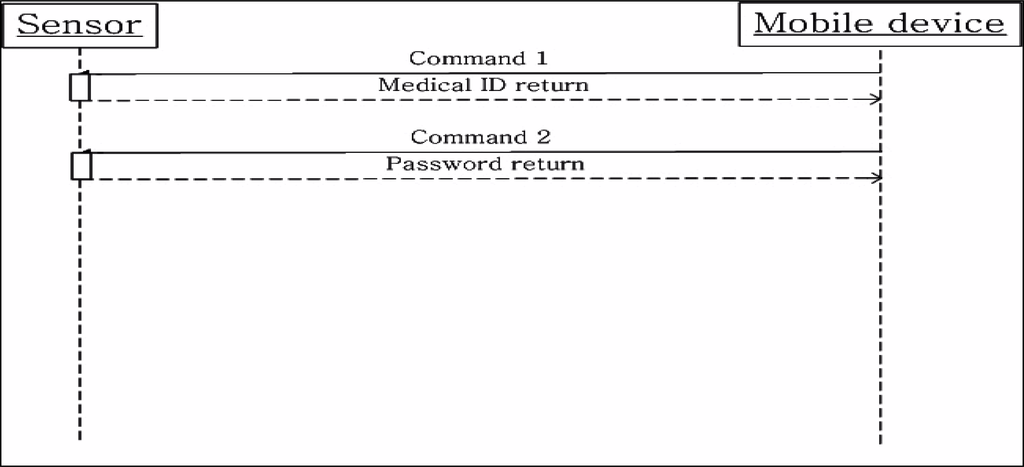 Command 1, as described in Table 4, transmits from the mobile device to a sensor after the connection is established in the link layer. The mobile device requests medical identification from the sensor and after the sensor returns it, the mobile device asks for the password from sensor. The program which is running on mobile device uses a decryption algorithm for the user ID and password authentication, and upon successful authentication, the mobile device connects to the server through the previously set IP address.