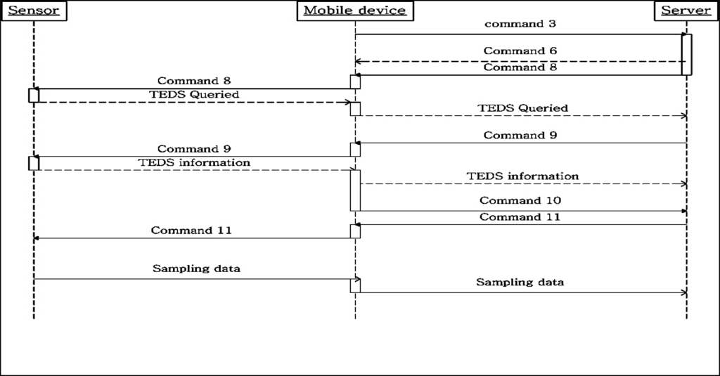 Mobile devices maintain one channel for each sensor, and each channel is used for both commands and sampling data transmission. The server can maintain several channels with one mobile device, one channel for command transmissions, and other channels for sampling data transmission. The command channel is the default channel that is established when the connection request is approved. Once the connection is approved, the server requires more information about sampling data transmission, such as information stored in the TEDS for each sensor. Command 8, “sr_QueryTEDS”, is the first command that the server sends to the sensor through a mobile device. This command obtains the category of TEDSs that the sensor supports, assigns a sensor support Meta-TEDS and TransducerChannel TEDS, and returns a message to inform the server it can Meta and TransducerChannel TEDSs. The server then knows the amount of TEDSs that can be read. The capacity of the sampling data channel depends on how much sampling data each sensor can transmit in the private channel, and in a common command channel. The channel is essentially the ports, eg., assuming an IP address of 192.168.0.1, the command channel can be 192.168.0.1 at port 1024, and one of the sampling data channel can be 192.168.0.1 at port 1025.