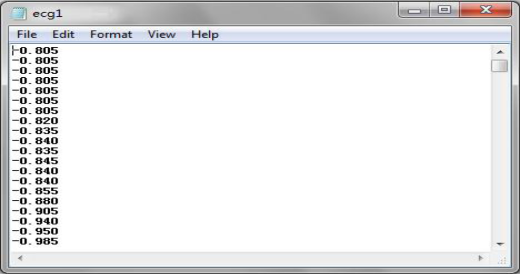 The two types of sampling data used in this experiment are ECG data and body temperature. A normal ECG data is a continuous stream of data with a sample rate of several milliseconds, thereby generating a large dataset within several seconds. The body temperature is sampled several times per day, consisting of three times in the morning, afternoon and night respectively. The ECG sampling data is adopted from PhysioBank’s 123rd record with MLII signals in the MIT-BIT Arrhythmia Database. The data is contained using text formatting, as shown in Figure 8 [12].