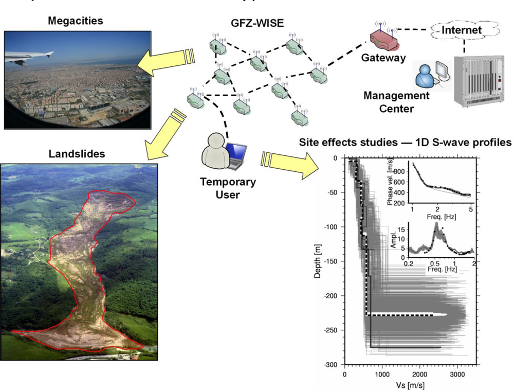 For monitoring application of special sites for which early warning or rapid response actions would also required, as landslides, special nodes that incorporate additional communications hardware, e.g., Internet connection, satellite phones, VSAT, etc., may serve as entities able to communicate data and parameters to outside of the network, such as a disaster management center. In particular, in the future it is intended to use the GFZ-WISE at landslide sites to monitor and analyze a combination of parameters (e.g., the S-wave velocity, ground motion, groundwater level variation, and rain gauge), and together with dedicated decision making algorithms, to detect and locate changes within the landslide. Hence, the GFZ-WISE system might provide real time early warning information about the possible landslide activation after earthquakes or meteorological events.