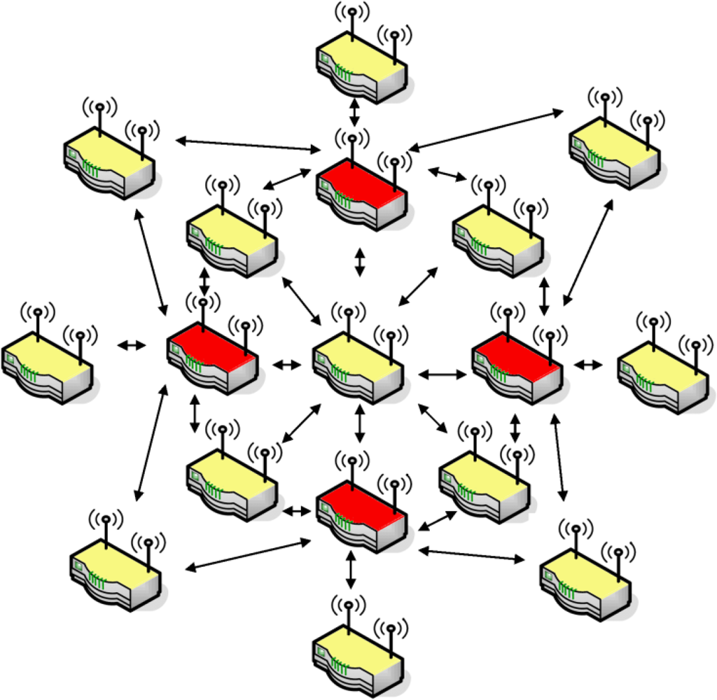 MultiPoint Relays protocol for communication within a dense array, i.e., how messages from a central node are distributed throughout a cluster. In practice, only a subset of the central node’s neighbors (red) need to rebroadcast the message.