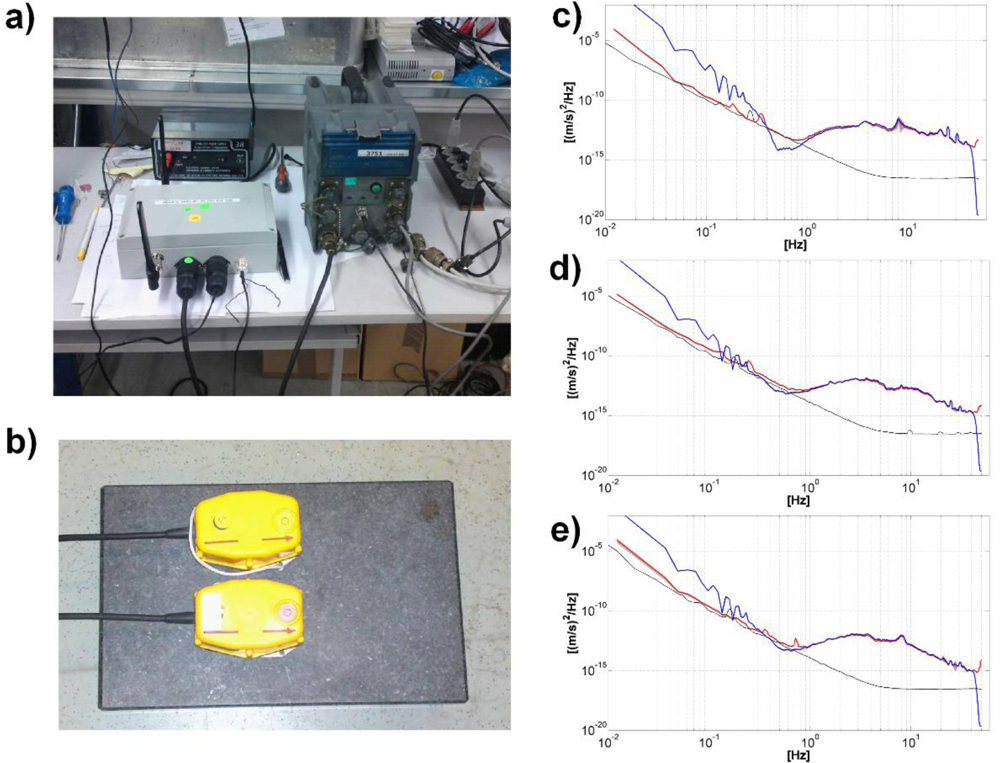 Results from the laboratory experiment. (a) GFZ-WSU and EDL digitizer. (b) 3D SM-PE-6/B 4.5 Hz external geophones deployed over a concrete slab. (c) Spectra from EDL (blue), WSU (red), WSU’s self-noise (black) for the vertical component of ground motion. (d) same as (c) but for the north-south component. (e) same as (c) but for the east-west component.