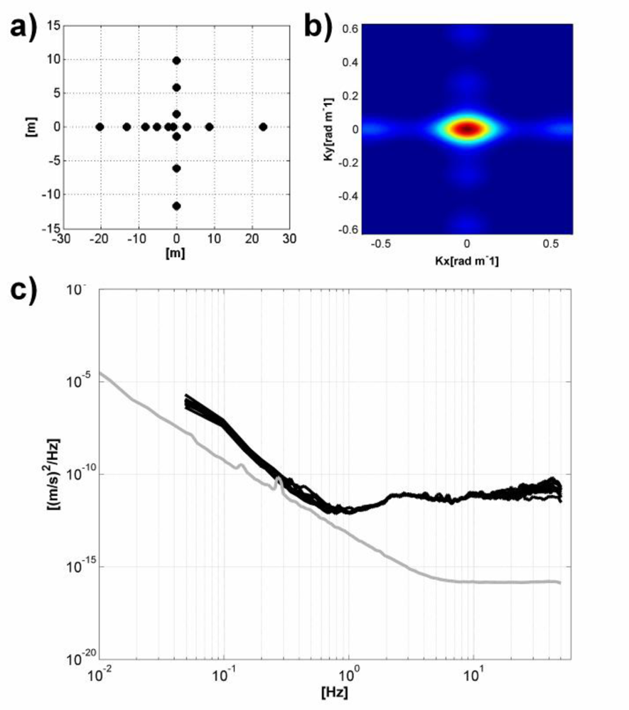 (a) Array geometry. (b) array response function. (c) experimental (black lines) and self-noise (gray lines) WSU spectra.