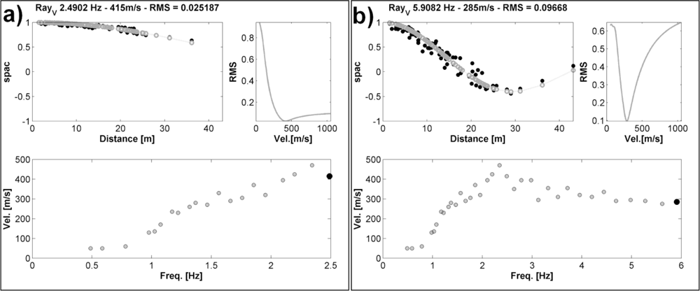 Moreover, Figure 7a,b, lower panels, provide an example of the phase velocity values estimated during the real-time analysis. A real-time analysis of the data allows the operator to observe in real time both the quality of the space-correlation values fitting procedure, and the evolution of velocity estimates with the increasing of the frequency.