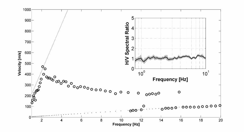 Consistent and reliable estimates of parameters related to site effects from seismic noise measurements are commonly retrieved from the analysis of the horizontal-to-vertical (H/V) spectral ratio curve [e.g., 28,29], and the Rayleigh wave dispersion curves (RWDC) (e.g., [3,5,7,30–33]).