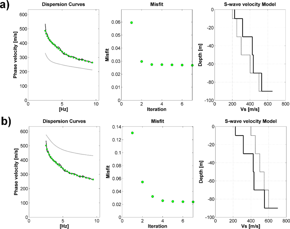 Results of the inversion analysis starting from different input models. (a) Under-estimated input model. In the left-panel are shown the experimental phase velocities (black line), those for the best-fit model (green dots), and the dispersion curves for the input model (gray line). In the middle-panel is shown the misfit for each iteration (green dots). In the right-panel are shown the S-wave velocities for the input (thin line) and final best-fit (thick line) models. (b) same as (a), but for an over-estimated input model.