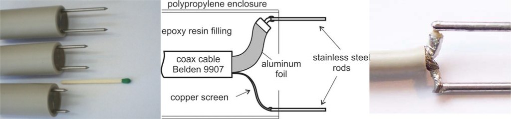 The applied dielectric sensors were built with two stainless steel rods of 2 mm in diameter, 13 mm separation distance and lengths of 1, 2 and 3 cm (Figure 1—left). The interface between the coax cable and stainless steel rods was constructed to minimize the impedance discontinuity (Figure 1—right).