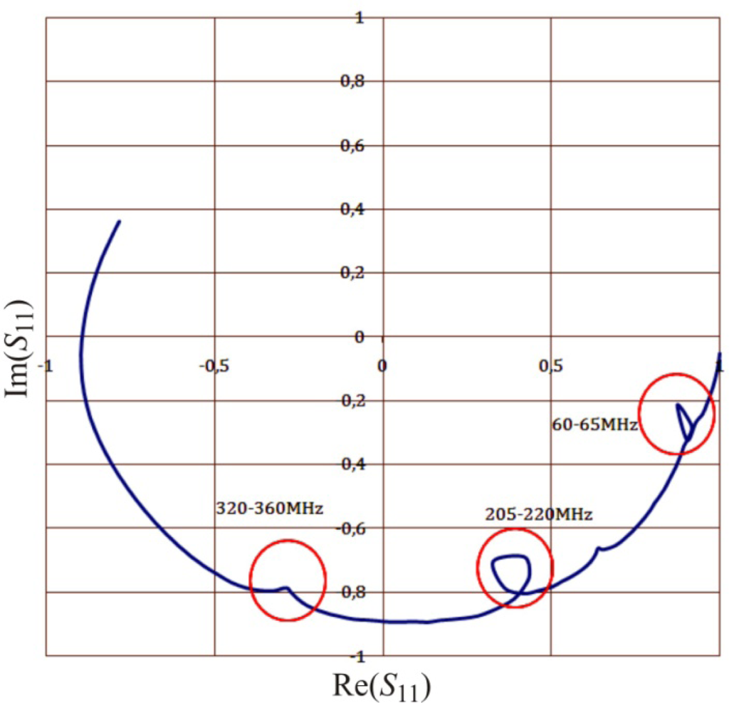 Resonance effects (in circles) on the S11 parameter measured by VNA.
