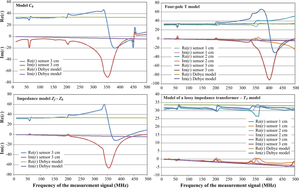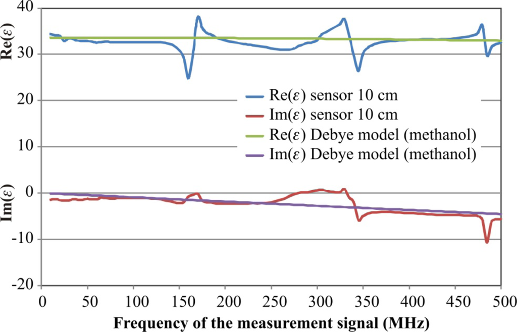 The four-pole T model performs better for both components of the dielectric permittivity, but for a 3 cm length probe the upper measurement frequency limit is still around 200 MHz and 350 MHz for the 2 cm length sensor. This model correctly follows the values of Debye model calculated for methanol as the reference liquid for the sensor of 1 cm rod length.