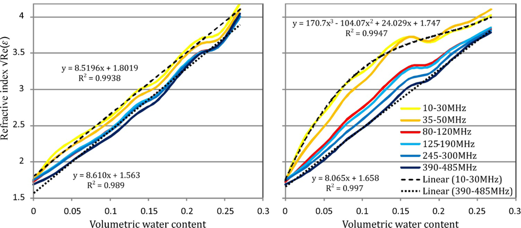 Figure 12 presents the relation between the soil refractive index √Re(ε) and volumetric water content for the soil 529 for various frequency ranges.
