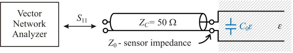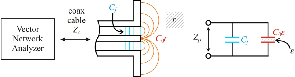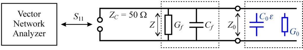 The termination of the open-ended sensor is described by capacitances Cf and C0ε, where the former is the fringing capacitance inside the coaxial waveguide of characteristic impedance ZC = 50 Ω and the latter is the fringing capacitance due to the test sample (Figure 2). The value of C0 represents the case when the surroundings of the C0ε capacitor is air.