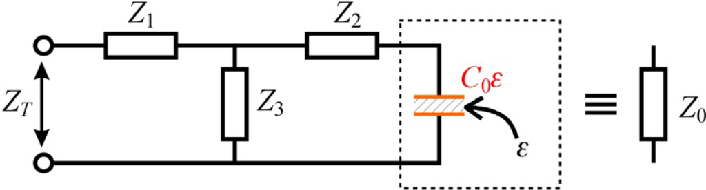 The impedance of the whole set can be substituted by ZT and rewritten in the linear form with complex coefficients a = Z1Z2 + Z2Z3 + Z3Z1, b = Z1 + Z2 and c = Z2 + Z3 and then rewritten again to incorporate the impedance of the sensor in air Zair: