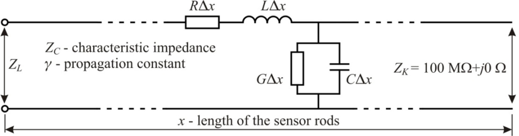 For high frequency signals the two-wire sensor should be analyzed as a distributed parameter system, opposite to a lumped parameter system, discussed in previous models. In this case a two-wire sensor is a transmission line composed with four-pole lumped elements (Figure 6) of unit values of resistance R, induction L, conductivity G and capacity C for the line unit length Δx [15].