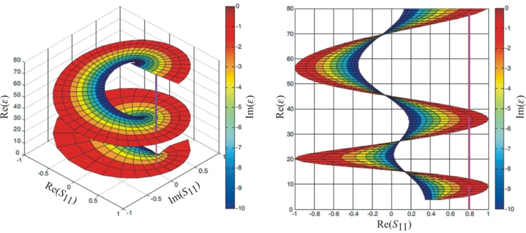 If condition (14) is met for the whole range of ZL values, multiple solutions can be obtained for ε. Inserting ZL as Zp into Equation (2) it is possible to visualize, with the help of the Matlab R2008b program [16], the relation of the complex function ε = f(S11), which is presented in Figure 7. The assumed values of x = 10 cm, f = 500 MHz. For a line perpendicular to the S11 plane the values of ε are ambiguous. Therefore the numerical solution is enhanced using a tracing procedure that first calculated ε at low frequencies, for which Equation (14) assures a single solution. Increasing measurement frequency results in meeting conditions for two or more solutions. To distinguish these solutions the procedure utilizes the former one to apply new limits of the function variability. Such approach enables to interpret the measurements in high frequencies where the wavelength of the measurement signal is shorter than the double length of the sensor rods. The detailed description of applied algorithm and calculation software is presented in [18].