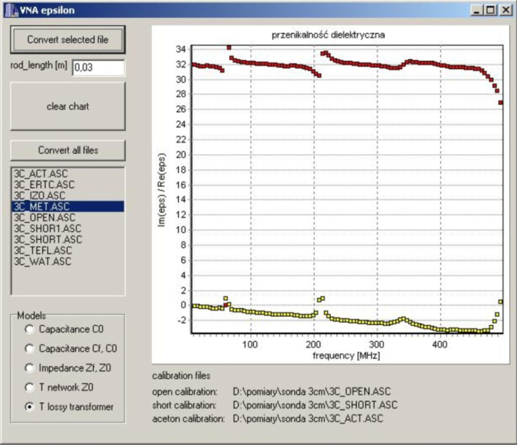 The raw data S11 from calibration measurements, as well as final measurements in the tested materials, were processed by a custom software application written in C++ Builder, where the final frequency spectrum of the complex dielectric permittivity was calculated and presented in graphic form. for each of the discussed model. Figure 8 presents the case with selected TT model. Real and imaginary parts of the complex dielectric permittivity are shown at the upper and the lower part of the diagram, respectively. More details of the application program are available in [18].