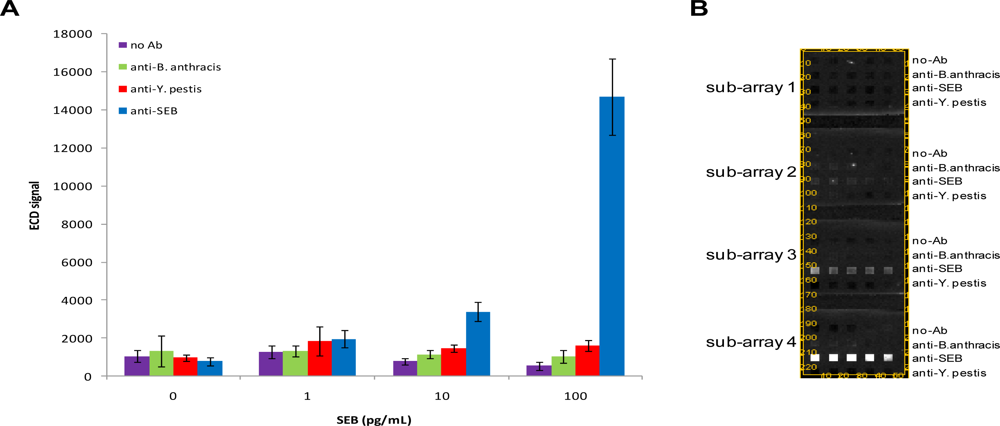 Electrochemical detection (ECD) assay for SEB. Antibody microarrays were incubated with 0 pg/mL, 1 pg/mL, 10 pg/mL, or 100 pg/mL SEB. Anti-B. anthracis, anti-Y. pestis, and anti-SEB refer to the antibodies immobilized on the chip surface. (A) Mean signals and SD; (B) Image of microarray.