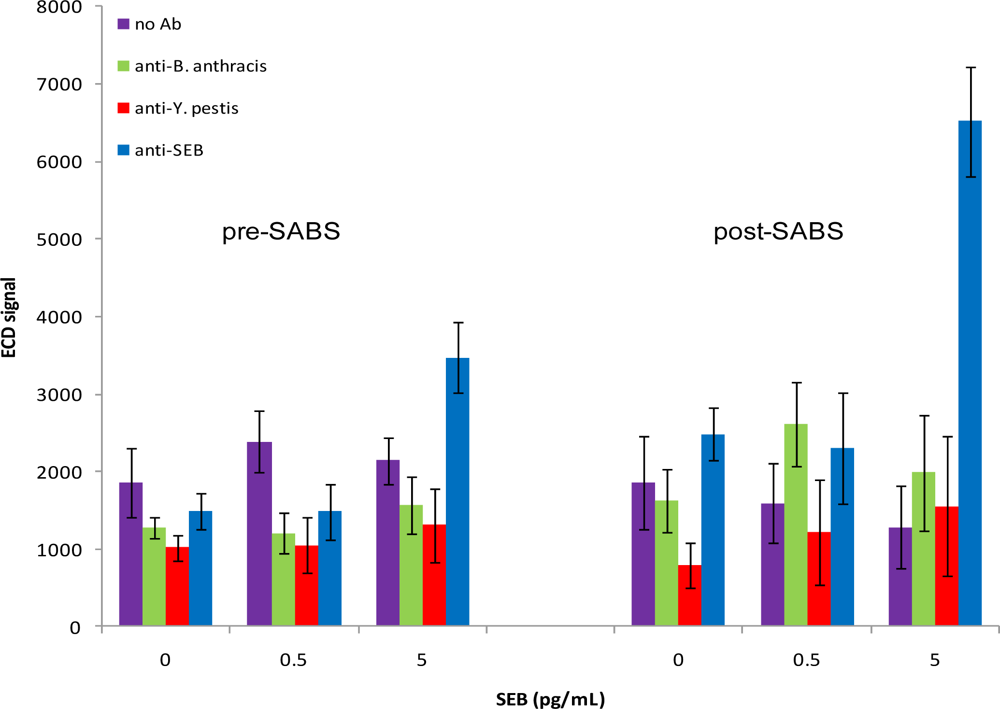 SABS assay for SEB. Chips were incubated with 0 pg/mL, 0.5 pg/mL, and 5 pg/mL. Anti-B. anthracis, anti-Y. pestis, and anti-SEB refer to the antibodies immobilized on the chip surface. Mean signals and SD are indicated.