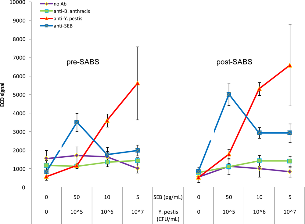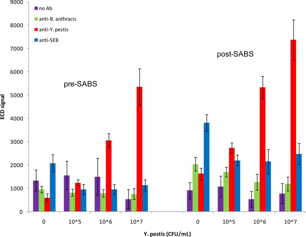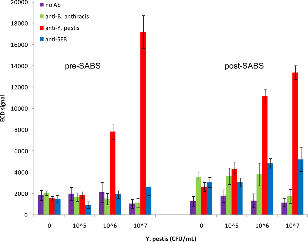 SABS assay for Y. pestis. Chips were incubated with 0, 105, 106, or 107 CFU/mL inactivated Y. pestis, followed by interrogation with biotinylated anti-Y. pestis. Anti-B. anthracis, anti-Y. pestis, and anti-SEB refer to the antibodies immobilized on the chip surface. Mean signals and SD are indicated.